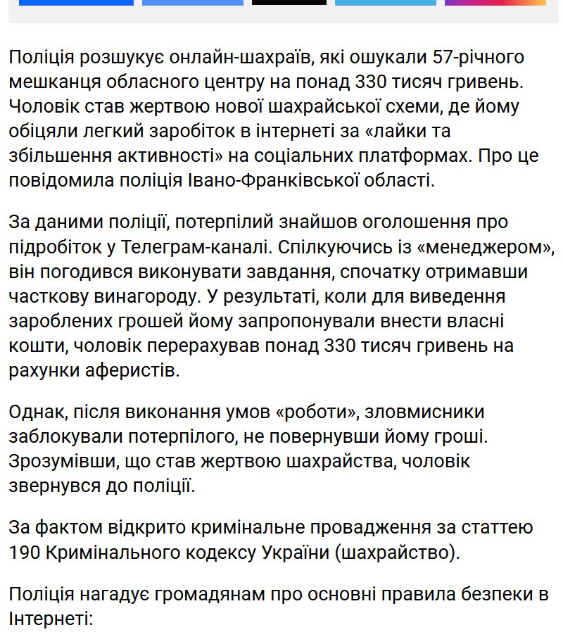 Ті, хто шукає підробіток в Інтернеті, часто натрапляють на оголошення на кшталт: «Заробляйте на лайках! Усього 2 години на день — і отримаєте від 800 гривень!». Проте за такими пропозиціями швидких грошей зазвичай ховаються шахраї. Основне джерело подібних оголошень — групи в Telegram.